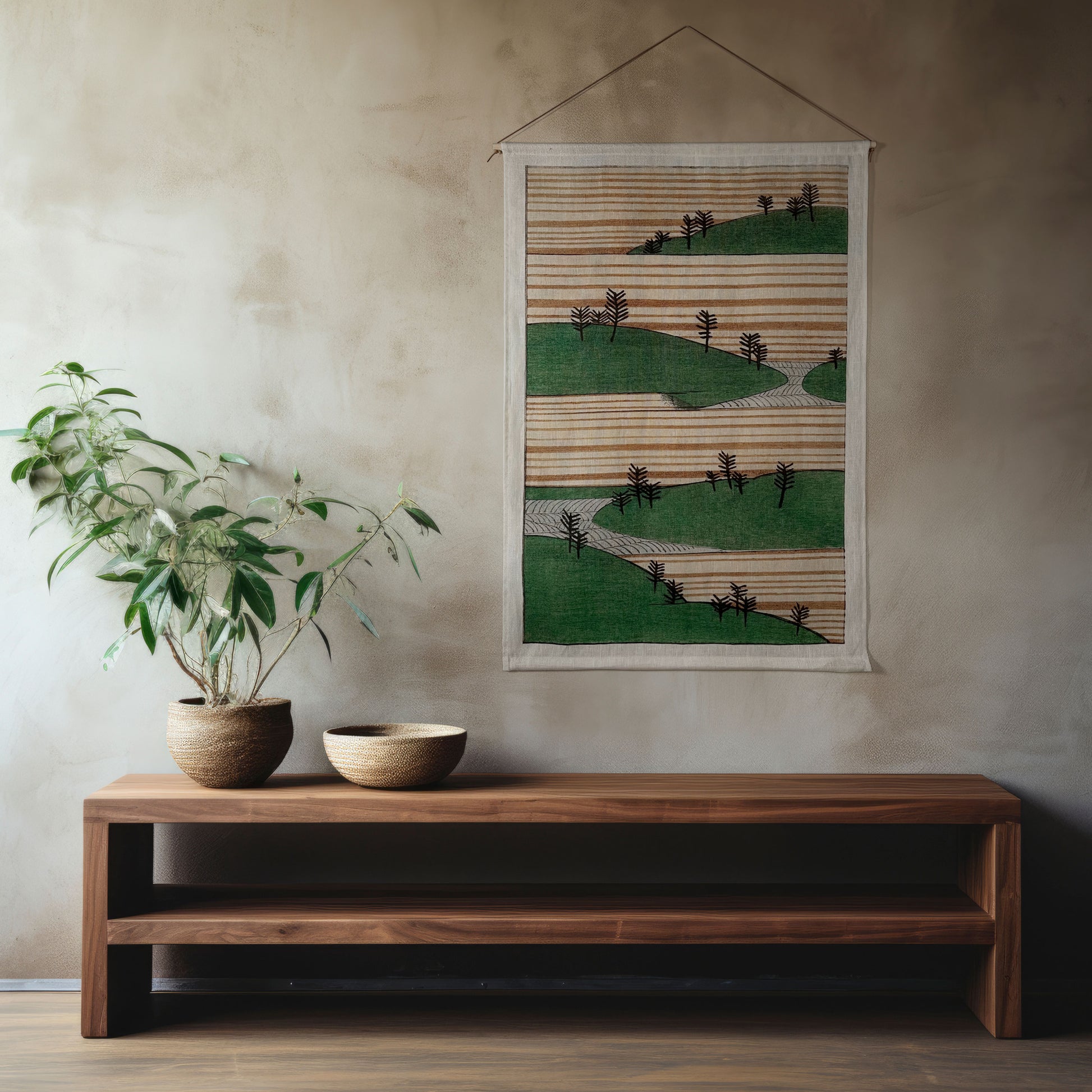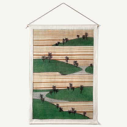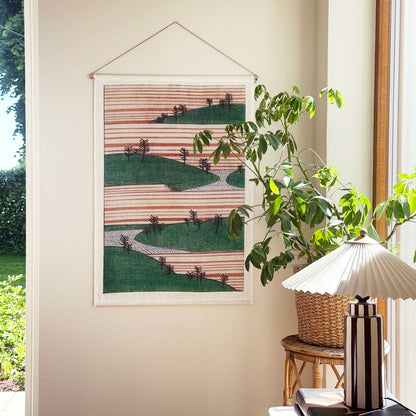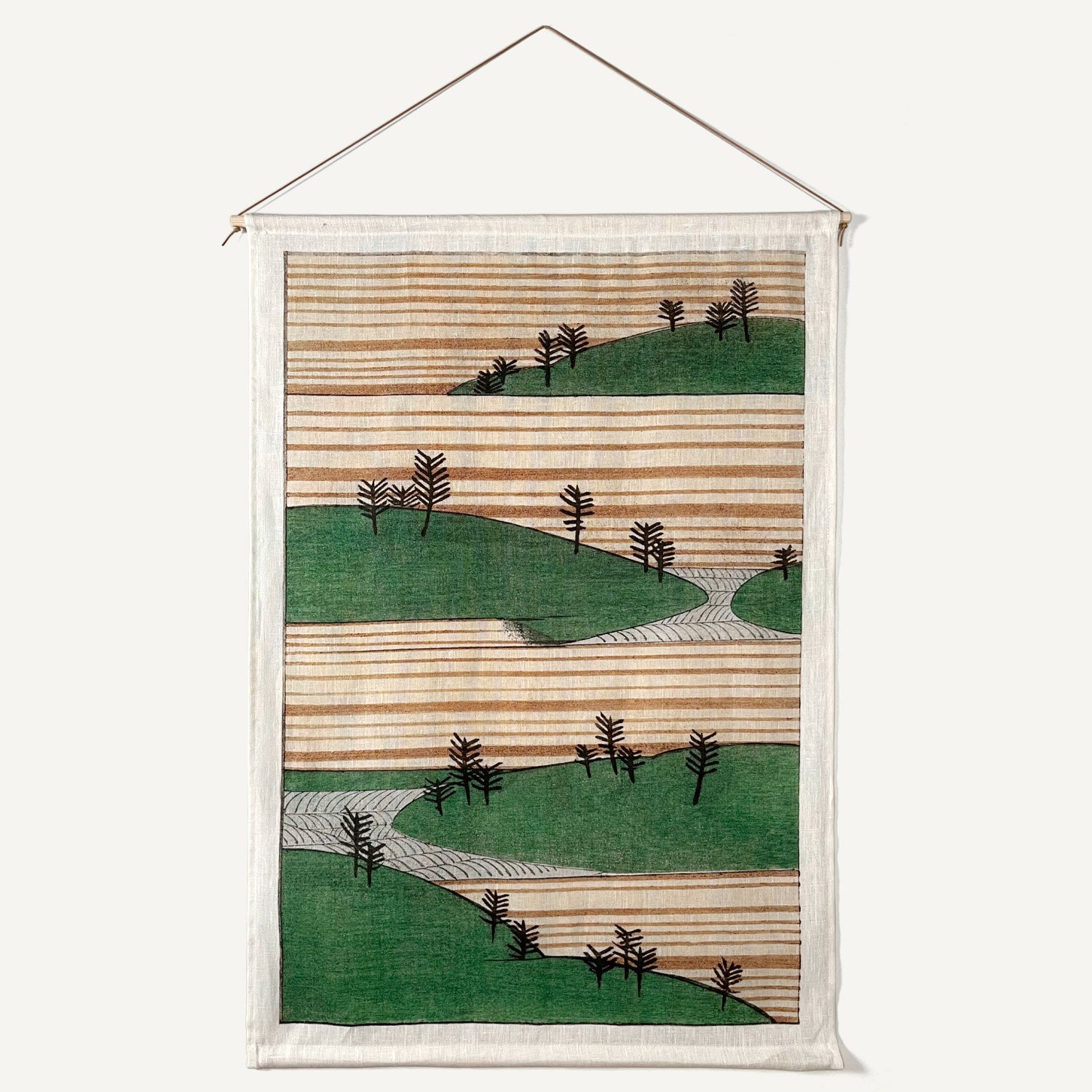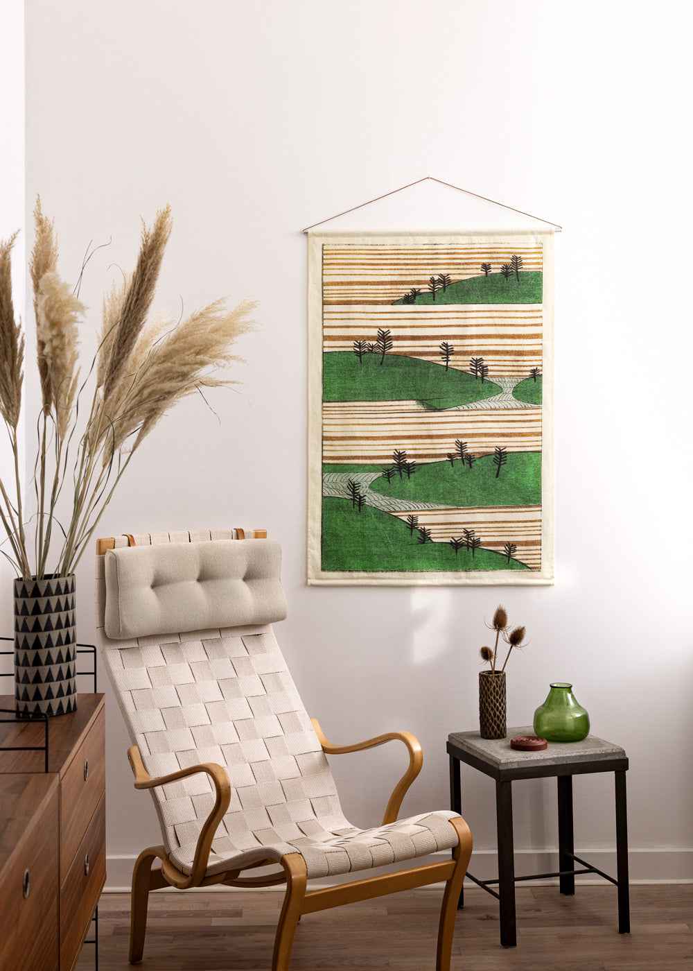 Our tapestries are printed in Finland on 100% linen. They come fitted on a wooden rod with a leather band for hanging so all you need is nail to hang them on your wall as soon as they arrive.